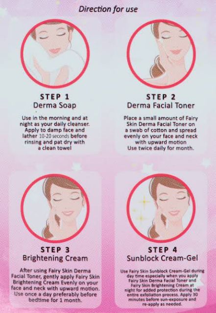 Fairy skin derma facial set is use for the treatment and prevention of severe cases of melasma pimples blackheads and whiteheads by penetrating pores to reduce break outs eliminate acne causing bacteria and remove dead skin cells it whitens dark spots blemishes and other discoloration such as freckles and age spots to achieve younger looking skin.